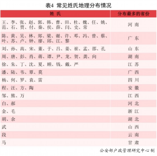 王、李、張等二十二個(gè)姓氏人口分布最多的省份是河南;劉、孫、高等十二個(gè)姓氏人口分布最多的省份是山東;徐、朱、丁等九個(gè)姓氏人口分布最多的省份是江蘇;潘、陸、韋等五個(gè)姓氏人口分布最多的省份是廣西;程、汪、方等四個(gè)姓氏人口分布最多的省份是安徽;鄒、熊、萬(wàn)三個(gè)姓氏人口分布最多的省份是江西……