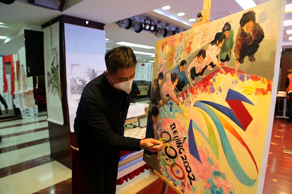 筆會開始,建國門街道工委副書記黃波發(fā)表致辭,預(yù)祝本場筆會圓滿成功。隨后,老年學(xué)校的師生們就各自發(fā)揮所長,亮出絕活兒?,F(xiàn)場氣氛熱烈,大家興致勃勃,揮毫潑墨,即興創(chuàng)作?;B畫班年近80歲高齡的陳淑云老師創(chuàng)作了主題“勇于拼搏 為國爭光”的人物畫;書法班教師王玉啟用擅長的隸書,書寫出“望神州山水歡笑迎冬奧 看華夏喜盼開幕倒計時”楹聯(lián)作品;篆刻班教師張書來即興把冬奧會“花樣滑冰”等比賽項目精心篆刻到一方方小小的印章上;素描班教師馬捷以油畫形式創(chuàng)作了一幅“童心迎冬奧”作品;山水畫班教師張桂長繪制的“冰雪騰起彩虹夢 健兒舞開春日花”寫意人物畫更是活靈活現(xiàn)、呼之欲出……師生們用他們獨特的構(gòu)思和創(chuàng)意盡情描繪著心中的奧運盛景,一筆一畫間無不暈染出他們對北京冬奧會最誠摯的祝福、最美好的期盼。創(chuàng)作結(jié)束后,老師們?nèi)砸猹q未盡,為表達(dá)對即將到來的冬奧盛會和虎年春節(jié)的期待與祝愿,他們又即興書寫了中國傳統(tǒng)節(jié)日春聯(lián)和福字贈與現(xiàn)場來賓,筆會在一片歡樂祥和的氣氛中圓滿結(jié)束。