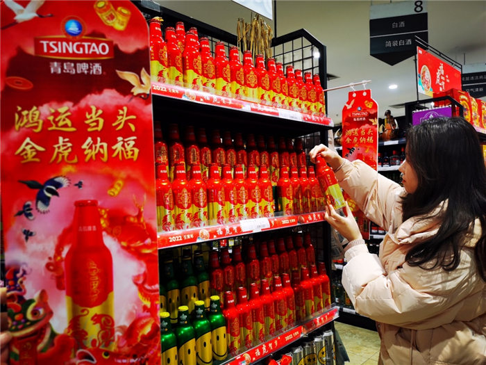 年味不僅是物質(zhì)上的豐富,也有文化上的追求。“過(guò)年就買‘鴻運(yùn)當(dāng)頭’,圖個(gè)好彩頭?!毕M(fèi)者王先生每年過(guò)年都會(huì)“鴻運(yùn)當(dāng)頭,先囤一波”,作為年夜飯的“必選項(xiàng)”?!澳暌癸埍仨毤t紅火火,不管是名字還是包裝,鴻運(yùn)當(dāng)頭就是喜慶,而且酒也好喝,每年還出不同的生肖版,我都收藏著著呢?!痹S多消費(fèi)者表示,這款青島啤酒成為春節(jié)當(dāng)之無(wú)愧的“鴻運(yùn)”年貨,走親訪友拎上一提,年味就出來(lái)了。