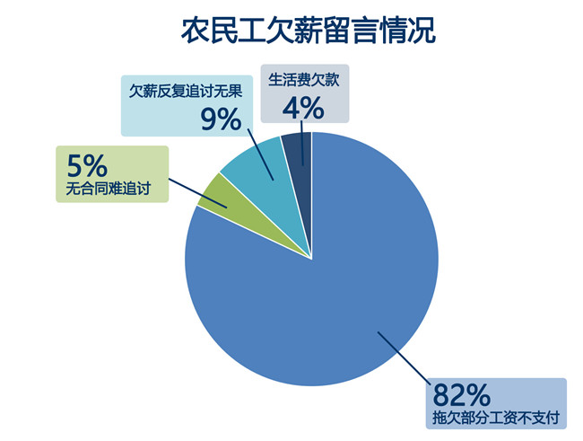 在群眾留言中,農(nóng)民工欠薪的情況大部分為薪資未全額支付,這類占留言總數(shù)的約82%;無勞動合同、反復(fù)追討無果以及拖欠生活費的情況也有發(fā)生。項目工程結(jié)算困難、用工方推諉則是導(dǎo)致欠薪的主要原因。