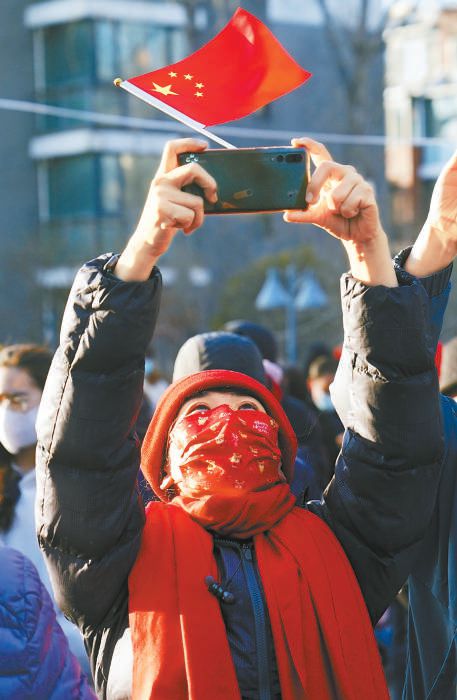 昨天,“重啟”的百旺茉莉園一期充滿了新年的喜慶,在小區(qū)南門廣場處,孩子們和居民們一起高唱《歌唱祖國》《明天會更好》,表達(dá)感激和喜悅之情。本報(bào)記者 王海欣攝