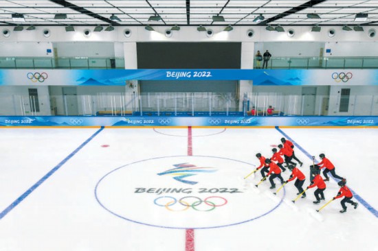 昨天上午,在冬奧冰球項(xiàng)目場(chǎng)地國(guó)家體育館訓(xùn)練場(chǎng),清雪服務(wù)人員“雪童”練習(xí)快速清雪,準(zhǔn)備迎接比賽到來(lái)。 本報(bào)記者 鄧偉攝