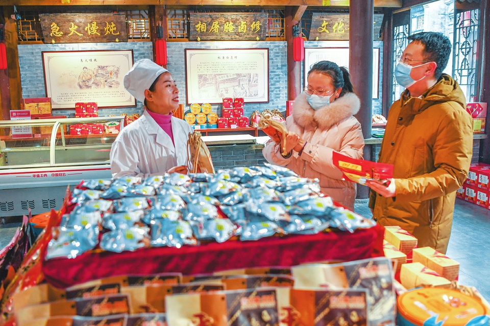 1月28日,游客在平遙古城一商店內(nèi)購(gòu)買年貨?;⒛甏汗?jié)將至,平遙古城內(nèi)花燈高掛,特色產(chǎn)品商店貨物充足,洋溢著濃濃的年味。(梁生仁攝)