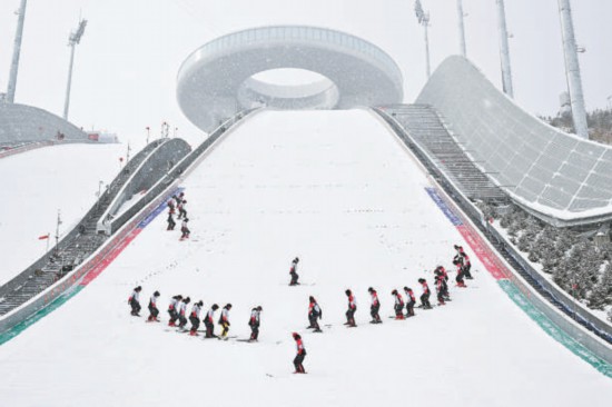 ——看文脈滄桑。雪中的現(xiàn)代化冬奧場館向世界講述著中國故事。首鋼滑雪大跳臺的曲線好似敦煌“飛天”的飄帶;國家高山滑雪中心的7條賽道如飛燕展翅,承載“吉祥”之意;國家雪車雪橇中心如巨龍臥于山下;國家跳臺滑雪中心則如同古代的玉如意擺件。在漫天飛雪中,我們看到了閃耀世界的中華文明。春雪之美,在樂享盛會。