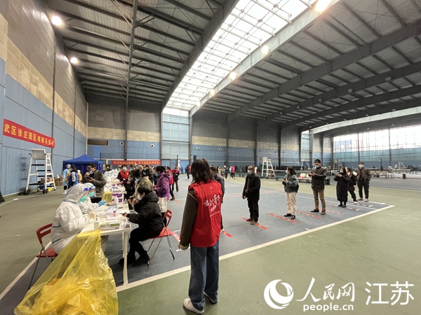 徐莊高新區(qū)體育中心網(wǎng)球館臨時集中檢測點,志愿者有序引導(dǎo)市民保持一米距離。人民網(wǎng) 李子佩攝