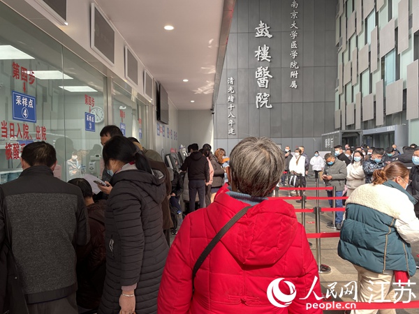 由于檢測人數(shù)較多,南京鼓樓醫(yī)院的核酸檢測隊伍存在一米間距不足的問題。人民網(wǎng) 馬曉波攝
