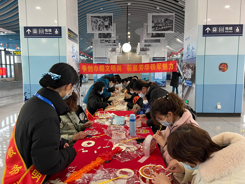 鬧元宵、扎虎燈、猜燈謎……節(jié)日里的杭海城際鐵路各車站熱鬧非凡。在張燈結(jié)彩的海寧海昌路站,工作人員熱情邀請乘客參加猜燈謎活動?;顒又校丝蛡冇械哪妓伎?,有的積極討論,歡歡喜喜猜著燈謎,為節(jié)日里增添了一份歡樂和喜悅。海寧鹽官站又是另一番歡樂的場景,工作人員親自動手,制作出一盞盞漂亮的虎燈,乘客們紛紛圍攏過來駐足觀看,希望在新的一年里贏得“好兆頭”,現(xiàn)場一片其樂融融,歡聲笑語。