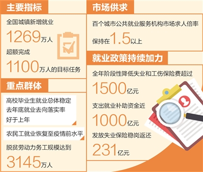 看主要指標(biāo),全國(guó)城鎮(zhèn)新增就業(yè)1269萬(wàn)人,超額完成1100萬(wàn)人的目標(biāo)任務(wù);全年全國(guó)城鎮(zhèn)調(diào)查失業(yè)率平均值為5.1%,比上年平均值下降0.5個(gè)百分點(diǎn),就業(yè)目標(biāo)任務(wù)圓滿完成。