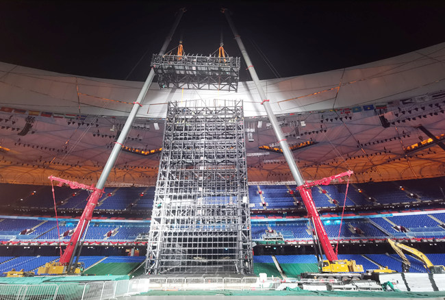 2月6日零時(shí),200多名北京城建集團(tuán)建設(shè)者及2臺(tái)500噸汽車吊、5臺(tái)液壓鉗等大型設(shè)備全部進(jìn)入“鳥(niǎo)巢”,開(kāi)始拆運(yùn)“冰瀑”大型表演裝置的鋼結(jié)構(gòu),為閉幕式舞臺(tái)布置騰挪出空間。