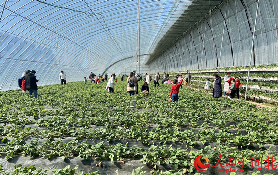 正定采摘大棚內(nèi),市民朋友在采摘草莓,體驗農(nóng)耕之樂。 人民網(wǎng) 付兆颯攝