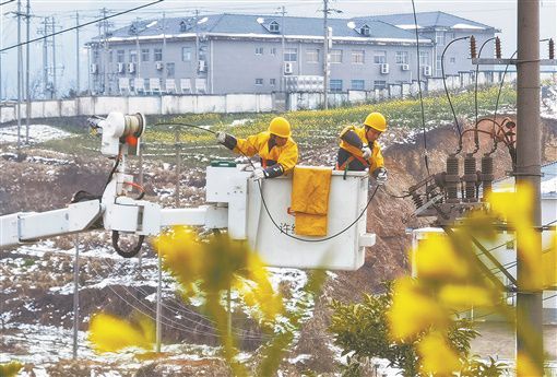 2月24日,田間地頭的白雪尚未融化,油菜花卻已悄然開放。國家電網(wǎng)洪江市供電公司工作人員在黔城鎮(zhèn)雙溪社區(qū)對10千伏巖垅線016號桿帶電解除引流線,確保線路正常供電。 胡浩 攝
