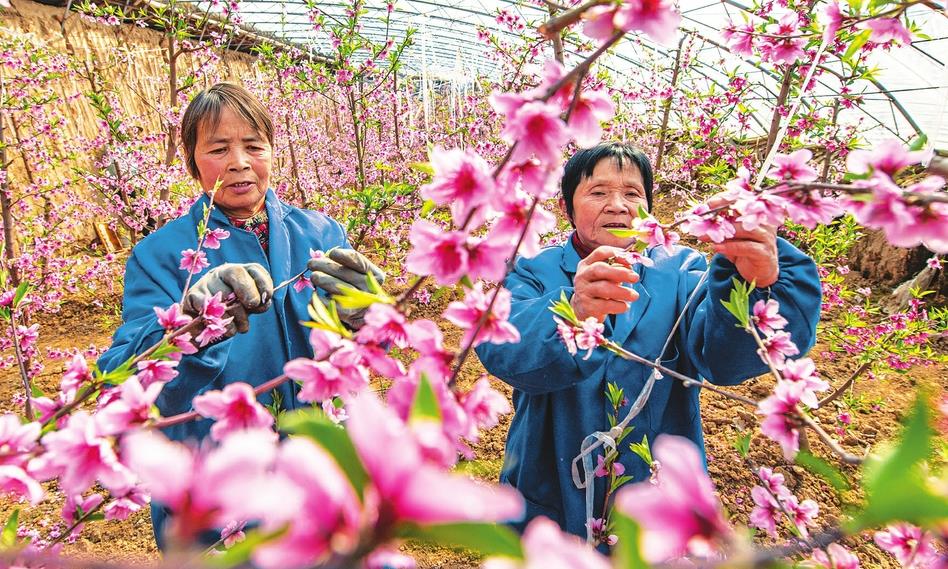 2月24日,夏縣南大里鄉(xiāng)南北晉村郭老蔬菜種植專業(yè)合作社社員在大棚內(nèi)給油桃疏花。該社根據(jù)本村地理氣候特點(diǎn),從山東引進(jìn)新品種,搭建11個(gè)大棚發(fā)展新品種油桃。該油桃成熟早、酸甜可口,遠(yuǎn)銷四川、河北等地,畝收入達(dá)2萬(wàn)多元。(薛俊攝)