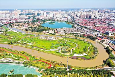2021年10月12日拍攝的滄州市百獅園生態(tài)修復區(qū)。滄州市百獅園生態(tài)修復區(qū)原是大運河沿線的兩個城中村,目前已成為城市內一道靚麗的風景線。(資料片)新華社發(fā)