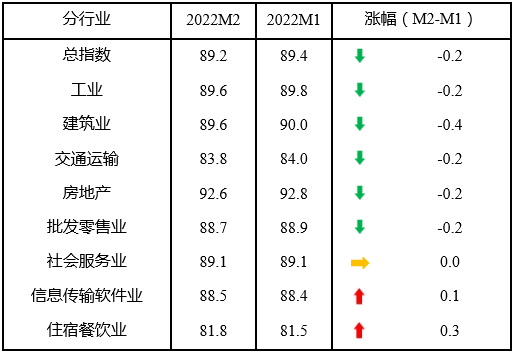 企業(yè)信心有待穩(wěn)固。外部環(huán)境不穩(wěn)定不確定因素增多;國內(nèi)疫情點(diǎn)多、面廣、頻發(fā),對接觸性服務(wù)業(yè)的影響加大,大宗原材料價(jià)格反彈,影響中小企業(yè)發(fā)展信心。反映企業(yè)信心的宏觀經(jīng)濟(jì)感受指數(shù)為98.3,比上月下降0.3點(diǎn)。所調(diào)查的8個(gè)行業(yè)中,5個(gè)行業(yè)宏觀經(jīng)濟(jì)感受指數(shù)下降。