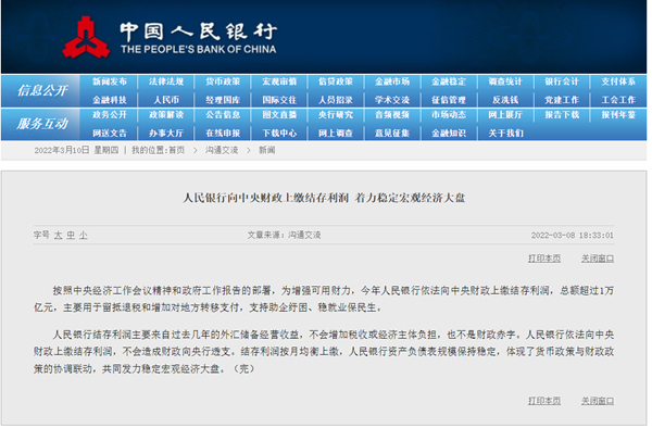 央行上繳萬億元結(jié)存利潤(rùn) 專家:增大轉(zhuǎn)移支付惠企利民