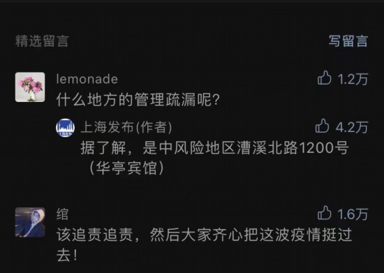 是什么地方的“疏漏”?“上海發(fā)布”在留言區(qū)直白回復(fù)網(wǎng)友:“據(jù)了解,是中風(fēng)險(xiǎn)地區(qū)漕溪北路1200號(hào)(華亭賓館)”。