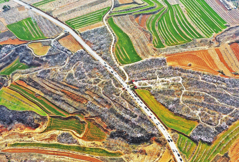 3月14日,無人機(jī)拍攝的畫面。連日來,垣曲縣嶺回村5000畝山桃花斗艷綻放,與綠油油的麥苗相映襯,構(gòu)成一幅多彩的美麗圖畫。眾多市民在認(rèn)真做好疫情防護(hù)的同時(shí),三三兩兩走出戶外,親近大自然,感受大自然,領(lǐng)略美麗鄉(xiāng)村春日無限風(fēng)光。(魯國林?jǐn)z)