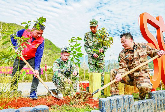 近日,在即將奔赴軍營前夕,金華婺城區(qū)莘畈鄉(xiāng)兩名應征入伍的青年,積極參加鄉(xiāng)里組織的植樹活動,將一棵棵樹苗種進土壤,也在心中種下保衛(wèi)祖國、報效祖國的種子。(吳潮宏)