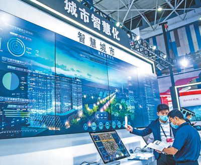在貴州貴陽(yáng)舉辦的中國(guó)國(guó)際大數(shù)據(jù)產(chǎn)業(yè)博覽會(huì)上,參會(huì)者了解智慧城市治理中心。
