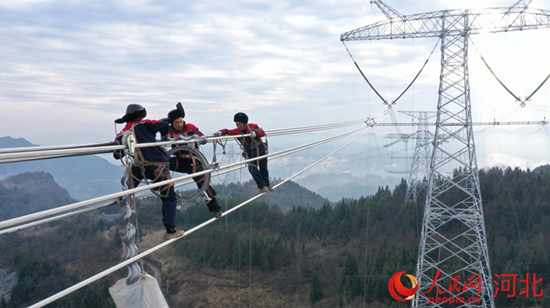 河北送變電公司高空作業(yè)人員認(rèn)真開展架線施工。 王學(xué)恩攝