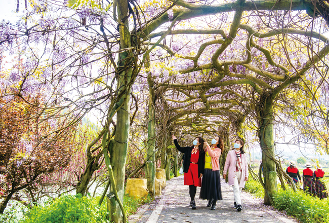 3月29日,在金華市金東區(qū)嶺下鎮(zhèn)釜章村,位于八仙溪邊的百米紫藤長廊花朵綻放,紫藤花從花架垂掛下來,像一串串紫色風鈴,吸引了一撥撥游客趁著春光明媚的好天氣前來觀賞拍照。(時寬兵)