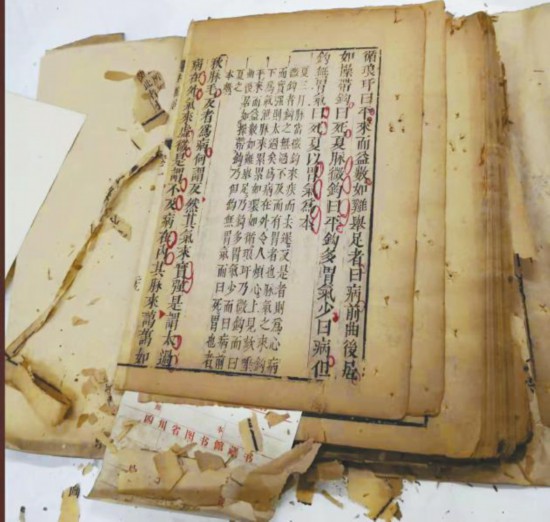 明刻版《圖注八十一難經(jīng)辨真》是近年來四川省圖書館修復(fù)的重要古籍。它是明代張世賢注釋的一部醫(yī)經(jīng)著作,刊于1510年,共八卷。袁東玨回憶,這部書是在四川省古籍普查中發(fā)現(xiàn)的。當(dāng)時用報紙包著送來,打開后,她倒吸了一口冷氣:紙張老化、脆化嚴(yán)重,不少書葉已碎成渣。最小的碎片僅一厘米長,還原非常困難?!氨热?,書中‘五行相生’中的‘相’字就斷裂開來,和其他文字碎片混在一起。我依據(jù)邊欄一塊一塊對照,才最終找到斷裂的碎片?!泵看涡迯?fù),她都屏住呼吸,生怕將碎片吹飛。不過,將一個個碎片拼接起來之后,她也很有成就感,“和年輕人玩拼圖一樣,折磨又有趣?!?/p>