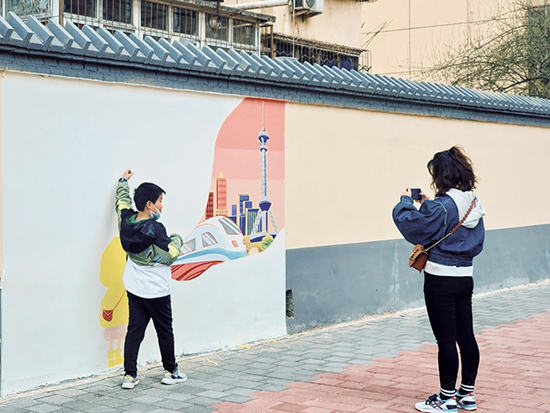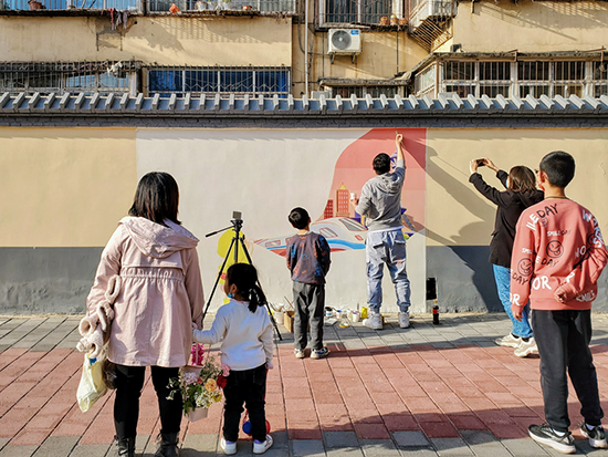 四歲的熱心市民“可樂(lè)”看著正在進(jìn)行墻體繪畫(huà)的工作人員贊嘆道,“可樂(lè)”的媽媽在旁邊開(kāi)心地笑著。