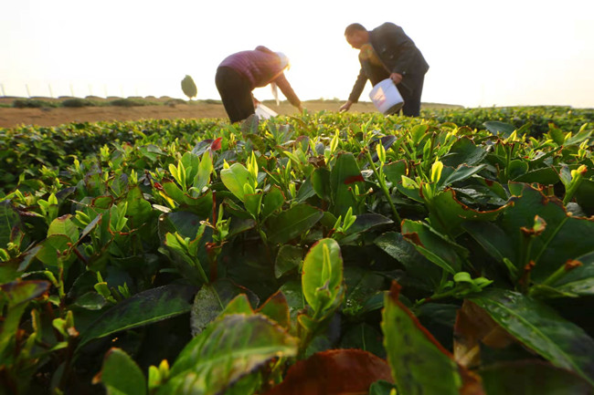 茶農(nóng)迎著晨曦采茶(資料圖)。 漢宏文攝