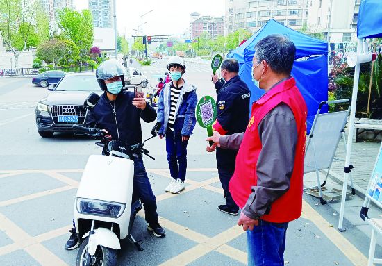 4月5日,在金華婺城區(qū)城東街道通園路社區(qū)各暖心服務(wù)點、小區(qū)出入口,管理人員落實測溫、亮碼、戴口罩的要求,“場所碼”逢進必掃,社區(qū)自行設(shè)計了便攜式“掃碼桿”。使用“掃碼桿”后,過往車輛和行人掃碼的效率明顯提高,縮短了通過時間,拉開了志愿者和來往車輛及人員的距離,避免人員接觸。(時寬兵)