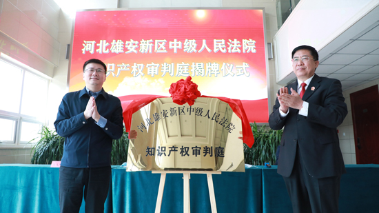 河北雄安新區(qū)中級(jí)人民法院知識(shí)產(chǎn)權(quán)審判庭揭牌儀式現(xiàn)場。 雄安中院供圖