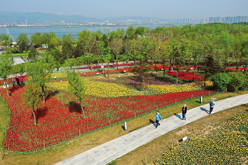 4月20日,太原市晉陽湖公園,市民正在參觀郁金香花展。近日,第三屆晉陽湖公園郁金香花展啟幕,今年栽種面積1.2萬余平方米,70余萬株。(記者李兆民攝)