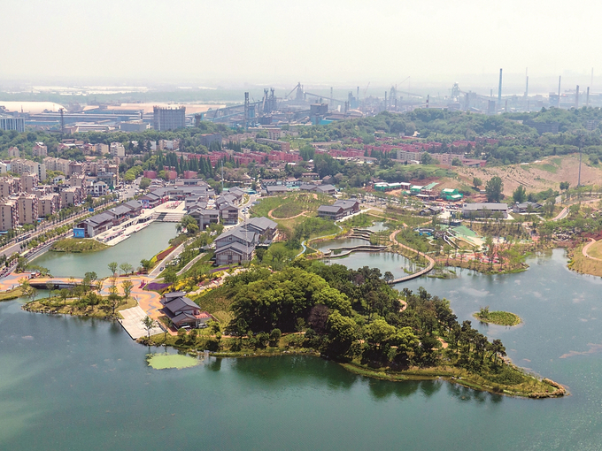 自二〇二一年起,南京啟動幸福河湖建設(shè)行動,截至目前,十七條幸福河湖已經(jīng)建成。圖為昨日航拍的南京桃湖公園。 本報記者 陳儼 攝