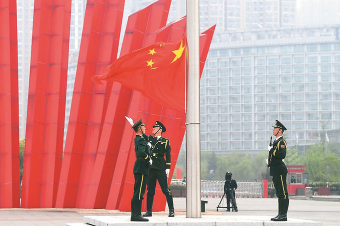 鮮艷的五星紅旗緩緩升起,迎著江風(fēng)高高飄揚(yáng)。 本報(bào)記者 萬程鵬 攝