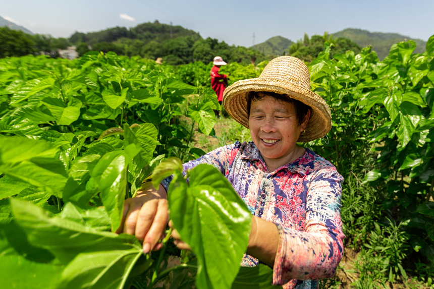 在澧田鎮(zhèn)雙江村蠶?;兀Q農(nóng)在采摘桑葉。朱國朝攝