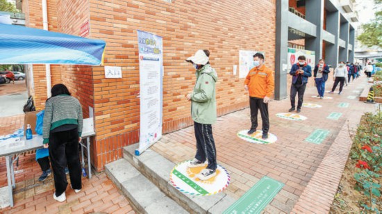 本報(bào)訊(記者 李瑤)昨天,東城區(qū)東四街道在轄區(qū)內(nèi)5個(gè)常態(tài)化核酸檢測(cè)點(diǎn)推出新式“兩米線”,通過(guò)充滿童趣的“呼啦圈”地貼,引導(dǎo)居民有序排隊(duì),保持安全距離。“呼啦圈”直徑大約80厘米,中間黃色腳印圖案十分醒目,旁邊還印有疫情防控科普貼,居民站在圈內(nèi)有序排隊(duì)等待核酸檢測(cè)?!啊粌H富有童趣,使排隊(duì)等候不再那么乏味,還嚴(yán)格規(guī)定了排隊(duì)距離,保證大家的安全。”居民點(diǎn)贊說(shuō)。本報(bào)記者 鄧偉攝