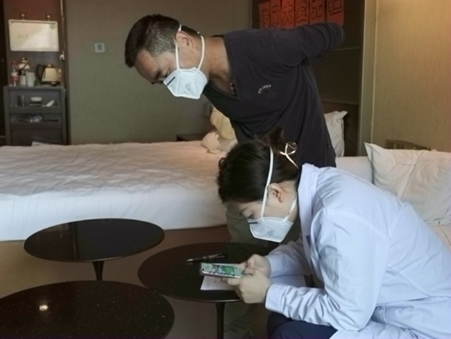 5月4日晚6點多,從香港求醫(yī)歸來的張氏夫婦懷抱著精神萎靡的哼哼,由機場大巴閉環(huán)轉(zhuǎn)運至海淀區(qū)紅杉集中醫(yī)學隔離觀察點,晚上8點半,到達酒店辦理入住。來自四季青醫(yī)院的張龍珍負責接待工作,豐富的工作經(jīng)驗讓她第一時間注意到了被母親抱在懷中的哼哼,臉有一些不正常的浮腫,便上前詢問情況,得知他患有神經(jīng)母細胞瘤并轉(zhuǎn)移至腦部及全身時,張龍珍便親自照顧起了這一家人,一步一步指導(dǎo)哼哼爸爸掃碼,填寫個人信息,并在前臺開放綠色通道,快速為他們辦理入住。