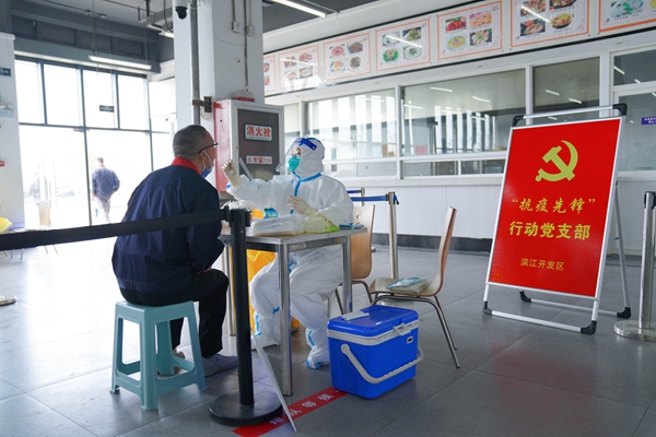 核酸檢測團(tuán)隊(duì)走進(jìn)制造業(yè)企業(yè)。濱江開發(fā)區(qū)供圖