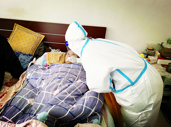 “暖心大白”為行動(dòng)不便的老人上門(mén)做核酸。 樂(lè)亭縣委宣傳部供圖