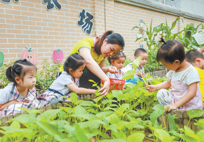 江西省贛州市全南縣幼兒園通過(guò)開(kāi)展“合理營(yíng)養(yǎng)與健康飲食”主題教育活動(dòng),引導(dǎo)孩子們均衡營(yíng)養(yǎng)、珍惜糧食。圖為老師在幼兒園快樂(lè)農(nóng)場(chǎng)教小朋友們采摘蔬菜。
