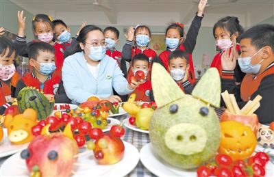 5月20日是“中國(guó)學(xué)生營(yíng)養(yǎng)日”。近日,山東省東營(yíng)市東營(yíng)區(qū)一家幼兒園里,師生把五顏六色的水果、蔬菜制作成各種造型,并在制作過(guò)程中了解各種水果、蔬菜的營(yíng)養(yǎng)價(jià)值,引導(dǎo)孩子們不挑食、不偏食,拒絕浪費(fèi),樹(shù)立健康飲食觀念。