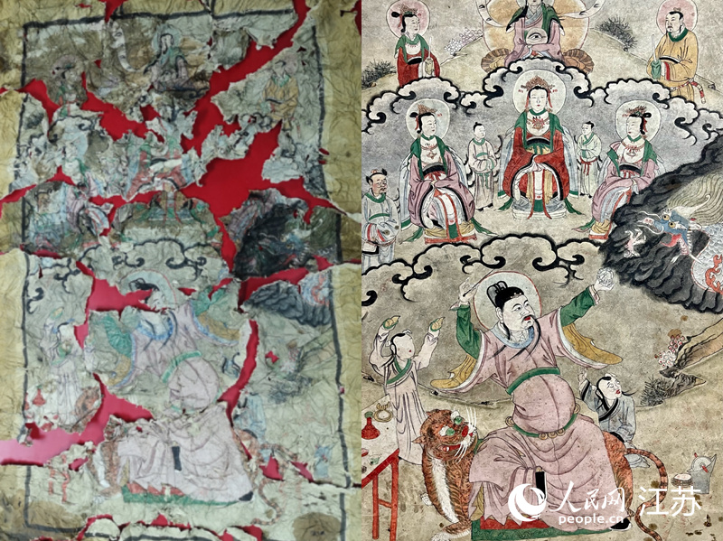 “一開始是想請我們鑒定這些紙張的成分,誰都沒想到里面有一幅畫?!痹谶@些外表堅硬,覆有泥沙的紙漿團中,陳思燚和團隊發(fā)現(xiàn)紙團內(nèi)部大有乾坤。經(jīng)過商討,他們決定使用蒸揭法,對紙團進行展揭。展開后的紙團,畫心內(nèi)容總共有188片,拼合完整后,為一幅顏色艷麗、內(nèi)容完整的人物工筆重彩畫。