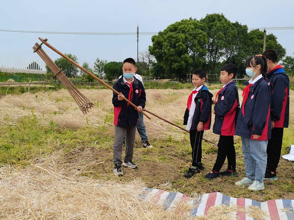 高淳區(qū)漆橋中心小學(xué)發(fā)揮地域優(yōu)勢,拓寬勞動實踐場所,依托街道中心村農(nóng)耕文化館開展“打菜籽”研學(xué)活動。“操縱梿枷時,前手上提,后手下壓,梿枷的轉(zhuǎn)軸循環(huán)轉(zhuǎn)動,反復(fù)拍打使油菜脫粒?!毙M廨o導(dǎo)員趙士華正詳細介紹油菜籽的收割、分離過程。通過講解,同學(xué)們對油菜籽的采收有了初步認識。走進田間,同學(xué)們紛紛擼起袖子,躍躍欲試。在趙士華的耐心指導(dǎo)下,同學(xué)們慢慢找到打油菜籽的正確方法,連枷不停地拍打下去,一粒粒油菜籽從油菜莢中躍出。同學(xué)們在了解農(nóng)耕知識、學(xué)習(xí)農(nóng)耕技能的同時,體驗勞動的快樂。