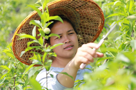 正在黃桃園打理的唐云云。受訪者供圖