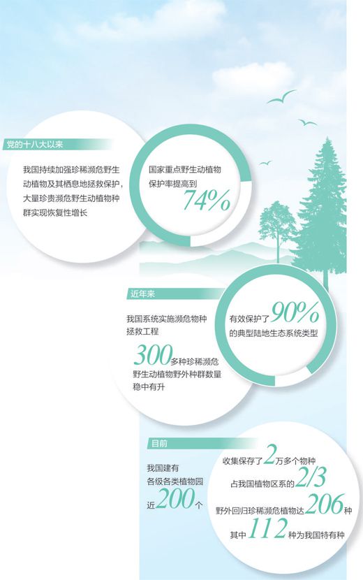 近年來,我國系統(tǒng)實(shí)施瀕危物種拯救工程,采取就地保護(hù)、遷地保護(hù)、放歸(回歸)自然、人工繁育(培植)等措施,有效保護(hù)了90%的典型陸地生態(tài)系統(tǒng)類型,300多種珍稀瀕危野生動植物野外種群數(shù)量穩(wěn)中有升。目前,我國建有各級各類植物園近200個(gè),收集保存了2萬多個(gè)物種,占我國植物區(qū)系的2/3。野外回歸珍稀瀕危植物達(dá)到206種,其中112種為我國特有種。麋鹿、普氏野馬曾一度在野外消失,目前通過人工繁育等方式,總數(shù)分別達(dá)近1萬只和700只左右,并成功實(shí)施放歸自然,重新建立了野外種群,生存區(qū)域和范圍不斷擴(kuò)大。