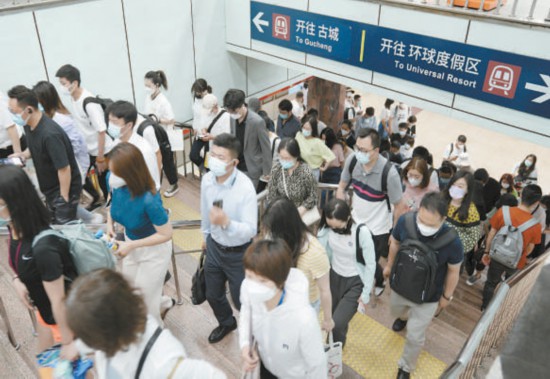 昨天早上八點(diǎn)半左右,地鐵國貿(mào)站呈現(xiàn)早高峰趨勢。 本報記者 劉平攝