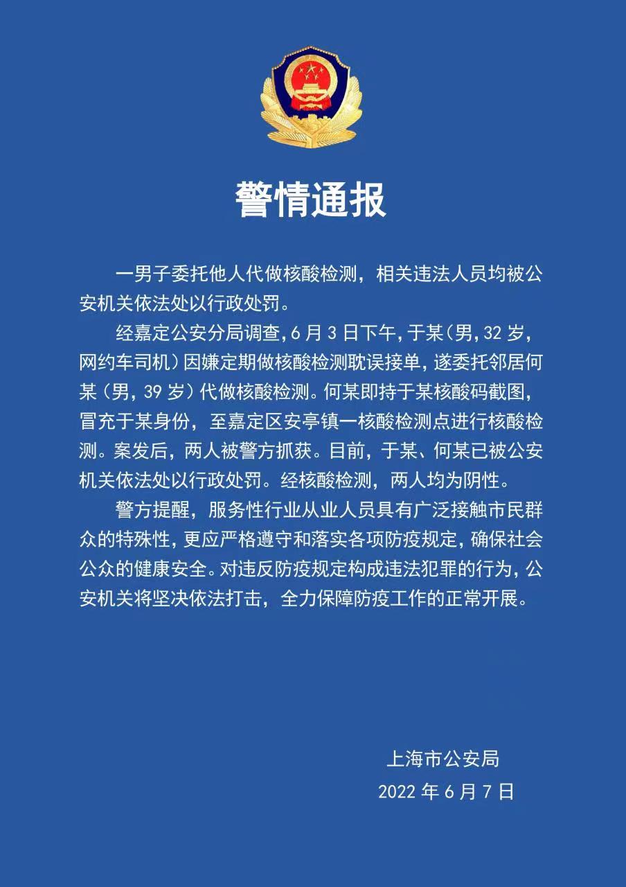 經嘉定公安分局調查,6月3日下午,于某(男,32歲,網約車司機)因嫌定期做核酸檢測耽誤接單,遂委托鄰居何某(男,39歲)代做核酸檢測。何某即持于某核酸碼截圖,冒充于某身份,至嘉定區(qū)安亭鎮(zhèn)一核酸檢測點進行核酸檢測。案發(fā)后,兩人被警方抓獲。目前,于某、何某已被公安機關依法處以行政處罰。經核酸檢測,兩人均為陰性。