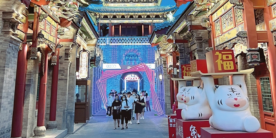 華燈初上,鐘樓街迎來了不少遛彎的人。鐘樓的鈴鐺在風(fēng)中搖曳,墻體上的燈光秀吸引眾人駐足;小朋友在布老虎雕塑前玩?zhèn)€不停,媽媽忙著拍照留念;穿漢服的少女與拍民國風(fēng)婚紗照的夫妻撞個(gè)滿懷,讓人宛若坐上時(shí)光機(jī),在歷史和現(xiàn)實(shí)中來回穿梭。