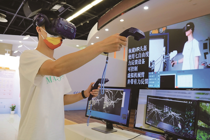 五月二十七日,東南大學(xué)舉辦“科學(xué)名世、人才報(bào)國”教學(xué)科研成果展,圖為現(xiàn)場(chǎng)展示的VR世界里操控虛擬機(jī)械臂。 本報(bào)記者 劉莉 攝