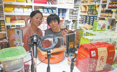 江西鷹潭市余江區(qū)大力推廣網(wǎng)絡(luò)購物、直播帶貨等消費模式,本地茄子干、紅薯粉絲等綠色農(nóng)產(chǎn)品搭上網(wǎng)絡(luò)快車,走上百姓餐桌。圖為余江區(qū)益農(nóng)電商運營中心經(jīng)理于小葵(左)在店里直播帶貨。