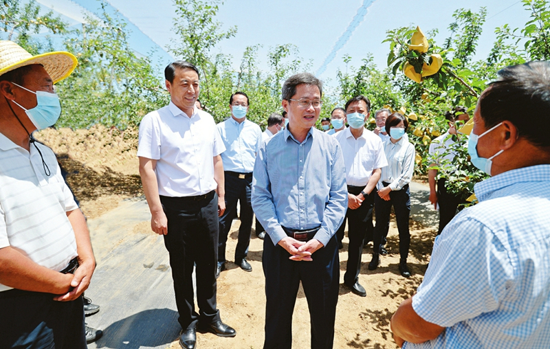 6月14日,省委副書記、省長(zhǎng)、省總河長(zhǎng)藍(lán)佛安來到吉縣柏山寺鄉(xiāng)“雙千畝”蘋果高新示范基地,與專業(yè)果樹種植戶親切交談,詳細(xì)了解基地建設(shè)及生產(chǎn)營(yíng)銷開發(fā)等情況。 本報(bào)記者李兆民攝